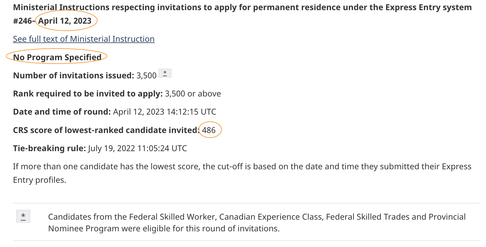 2023年4月12号加拿大快速通道EE最新的全类别抽签分数是486分。
